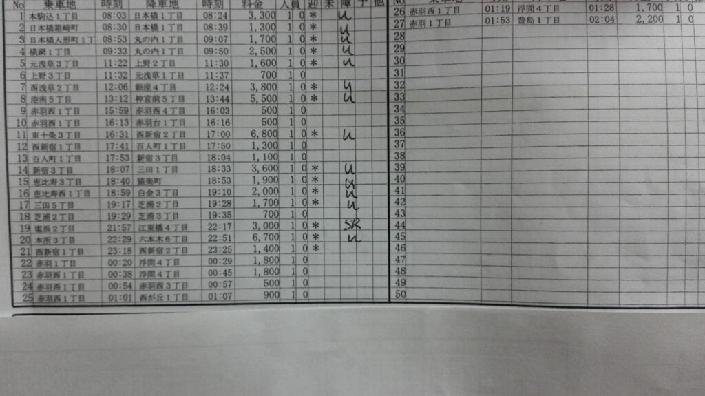 今日は6時半点呼。K師匠の体調不良で仕事前に買い物をして、師匠のマンションへ配達してから仕事を開始です。今日も都心で営業しようと17号を登って行きます。Uが鳴り駒込へ行きます。ここから都心で営業していきますが、午後、急用ができたので一旦自宅へ戻ります。用事を済ませた後、赤羽から営業を開始します。赤羽のプールはやはり満杯状態。とりあえず、どれくらいで回転するのか見ることにします。するとかなりのスピードでお客さんが並んできます。板橋あたりまで行けたらいいと思いつつ仕事をしていると、Uが鳴り東十条から西新宿のワシントンホテルまで外国人の若い女性が乗車してくれます。車中で話すと、ホテルが取れなくて友人の家に泊っていたそうです。