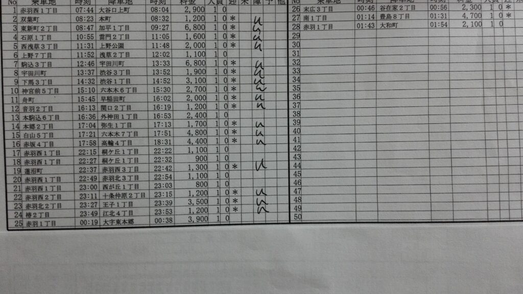 22時から赤羽西口から再スタート。今日は足立区へ行くことが多かったです。手上げとUが半々くらいで夜も売り上げを作ることができました。赤羽界隈で夜営業できたので早めに帰庫することにします。今日は19時から22時まで休憩してしまいました。仕事中に私用をこなすことができるのがタクドラのいいところですね。都内のどこへでもタクシーで向かうことができるので予定がこなしやすいです。都心から赤羽までも1時間あれば戻れます。今度は夜羽田に行ってどれくらいで赤羽まで帰ってくることができるかも確認してみようと思います。