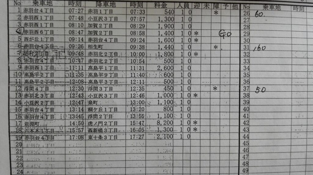 7時に点呼してKさんと同じ時間に出発です。今日こそは赤羽に1日いることを固く誓います。Gを切って乗り場専用ザクとなれるのか。赤羽に向かう途中で手上げがあり、赤羽駅まで乗せます。障害者割引だったので10円単位の精算となり、小銭を持っていないと対応できないことに気がつきます。自分の財布の中から払えたのですが、つり銭準備金のことを考えなくてはと思いました。その後は、赤羽周辺の会社への送りをこなし、また一つ発見。Gは空車にすると勝手に配車モードに入ってしまう面倒な仕組みなのですが、切り忘れてGで配車されることが多く、空車してすぐに切らないといけないことに今日気づきました。今まではあまり意識していなかったのですが、Gで配車された女がひどい奴で朝から気分を害します。8時47分に乗ってきた若い女の行き先はT大学。9時から授業なので8時55分に着くように言われます。この時間は姥が橋陸橋のところは大渋滞で、裏道もあるのですが合流地点がかなり短くタイトな設計。態度の悪いこの女のためにそこまで苦労したくないので、渋滞していて間に合わないことを実車ボタンを押す前に告知して判断してもらいます。結局乗ってきて後ろで渋滞の文句を言ってます。ぼくからすると、早く起きればいいだろと思うだけですが、こんな利用客が多いのも事実。実際にこのやり取りがイヤで夜勤をしている人もいるそうです。しかも、この女の指定してきた乗車場所は1車線工事中のど真ん中。どこから乗ってくるのかわかりませんし、停めれません。Gの客はこんな感じなのかと勝手に判断し始める機会となりました。まあ、9時10分には到着し、初日のイノシシ女と一緒で到着してからダッシュするわけでもなく学校に消えていきました。急がされても真に受けないほうがいいですね。Sも搭載されているのですが、Gよりは鳴らないというかまだ一度も着信音を聞いたことがないことに気づきました。まあ、Sの方はとらなくてもペナルティーがないと聞いてるのでつけっぱなしにしています。配車アプリの話は乗務が暇なときに説明しようと思います。今は、赤羽の攻略と手あげの獲得に集中してK師匠のようなオールドスタイルで行くことにします。赤羽駅からだと板橋区へもよく行くので、北区と板橋区の地図を買おうと思いました。東口へは当分いけなさそうですね。