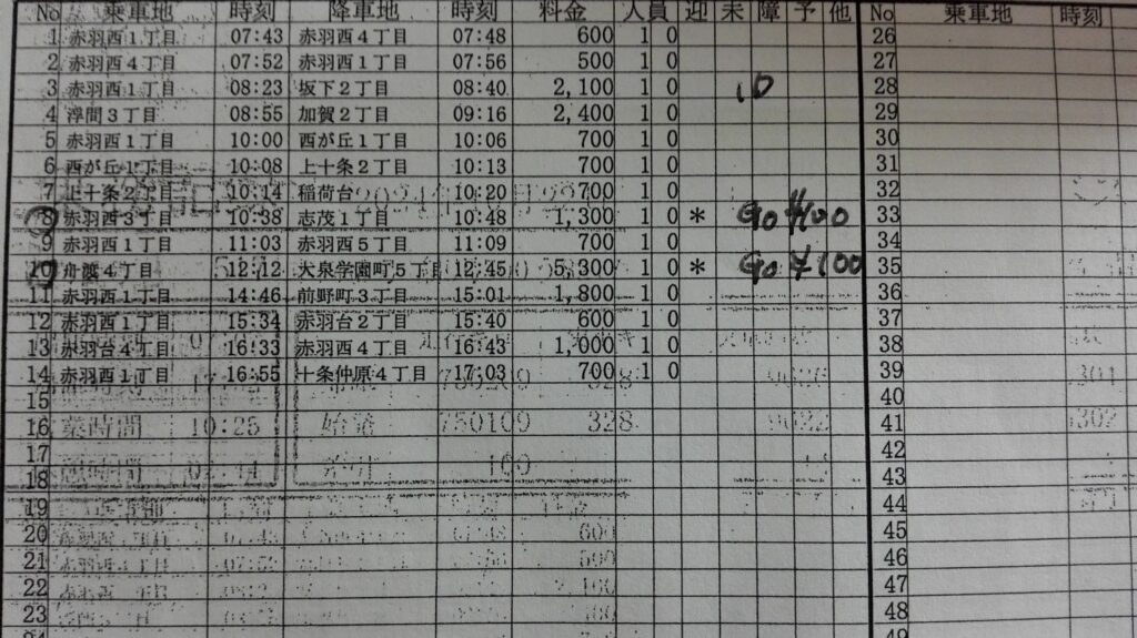 今日も7時点呼でK師匠と同時に出撃です。しかし、赤羽西口のタクシー乗り場にはいつもの倍以上の空車が待機しています。あまりに回転が悪いので、久し振りにGを開局。すると、稲付神社のがけ下あたりの住宅地へ行くように指示。とんでもない強隘路の場所で病院へ行く歩けないおばあさんのために、家の玄関に直付けを依頼されます。バックで切り返し5分以上かかって着車。1300円の乗車でしたが、体感的には3000円くらいもらわないと割の合わない仕事でした。この点、駅付けは単価が安いですが簡単に乗せることができるし、車椅子の人も車の目の前までこれるスペースが確保されています。赤羽の狭いポイントもK師匠に確認する必要がありますね。その試練のご褒美か、Gで呼ばれた戸田斎場から練馬へのお客さん。ミドルのお客さんでした。