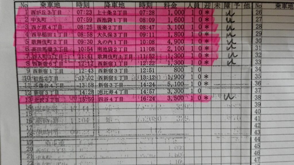赤羽に戻るべく北を目指しますがUは鳴り止まないです。新宿まで引っ張られたので、甲州街道をひた走り、地元の町へ帰りました。すると上北沢でGが鳴り卒業した小学校の目の前のマンションから老齢の男性が乗車してきます。行き先はバスタ新宿。初めて行きました。この男性は、ぼくの同級生のオリンピック選手のことを知っていて、このマンションに住んでることも知っていました。話が盛り上がりあっという間に新宿に到着しました。やはり地元はいいですね。いろいろと話ができました。その後、バスタから外国人のお客さんを恵比寿へ、そして環七で赤羽に行こうとすると、下北沢にUで呼ばれ、外国人家族を四谷のホテルまで送りました。もう、活動限界なのでアプリを切り赤羽に帰庫しました。。。