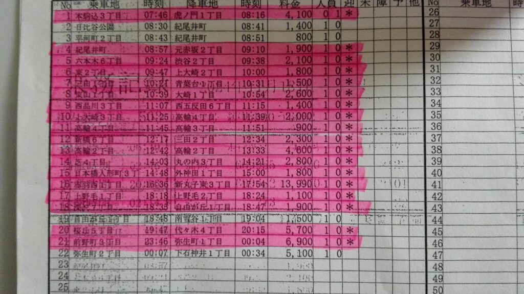 武蔵小杉でした。。。万収です! 首都高の板橋本町は閉鎖されていたのでお客様に説明して王子南から高速に乗ります。面白いのが、この中国人は道中ずっと携帯で仕事の指示を部下に出しています。ぼくは上海に5年以上駐在していたので内容はほとんどわかるのですが、不動産関係の話をずっとしていました。おそらく、不動産の投資の判断をする金融関係者だと思われます。タクシーの中は動く執務室と考えれば、移動時間も無駄にすることなく仕事ができるんですよね。特に、公共交通機関では電話できませんが、タクシーは誰に気兼ねすることなく電話できるし、重要な機密情報も話すことができます。まして、運転手が中国語を理解するとは思ってないでしょう。何か重要な情報があれば株取引とかもできそうな面白い仕事です。まさかの夕方神奈川行きとなりましたが、ぼくのふるさと世田谷界隈を流しながら赤羽を目指します。日体大の学生を乗せたり、千歳船橋から参宮橋へ行ったりします。夜間営業も楽しいですね。K師匠から早めに上がって赤羽の行きつけのスナック飲もうと言われていたので、0時には帰庫したかったのですが板橋本町でUが鳴ります。行き先は赤羽あたりかなと思うと、逆方向の中野新橋。。。トドメは着発で若い女性から乗車依頼が下石神井でした。約1時間で1.2Kの売り上げ。青短といわれる夜間営業の威力を体験しました。タクシーは22時から翌朝5時までは2割り増しになります。つまり、昼の10Kは夜間であれば1.2Kとなるので、夜勤のシフトは稼げるので人気があります。そして、道が空いてるので効率よく稼げます。工事渋滞がなければ走行時間当たりの単価がとてもいいのです。女性に断りを入れて、K師匠に今日は遅くなると話して了解してもらいました。いろいろと大変でしたが、翌日は1日寝ていられるので少しくらいは無理がきくのかなと思います。収入も68Kいったので日勤の2日分は稼げました。でも、今まであまり経験しなかった夜間の運転に慣れるように頑張りたいと思います。