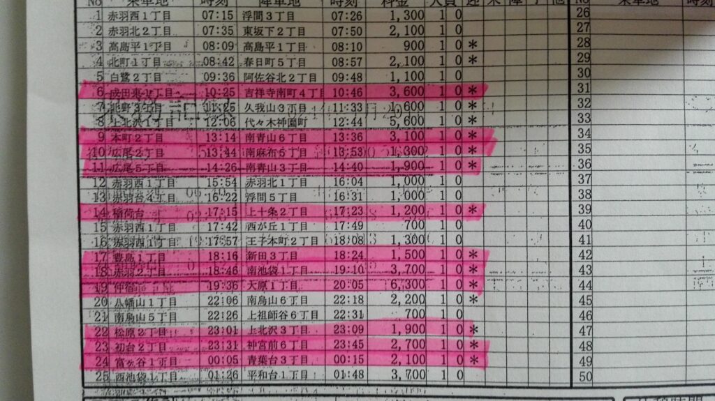 今日も6時半点呼。K師匠と一緒に赤羽西口からスタートします。しばらくするとGが鳴ります。ワンメーターでした。しばらくするとGが鳴ります。凄く狭い路地の一軒家から練馬の法務局でした。練馬まで来たので世田谷を目指し南下して行きます。杉並でUが鳴り吉祥寺まで引っ張られます。井の頭通り経由で世田谷に戻っていると、上北沢から明治神宮までのお客さんを乗せます。都心に来たのでしばらくは中にいることにします。赤羽を目指して戻ることに成功したのですが、Uで板橋から大原まで戻されてしまいました。とりあえず世田谷界隈でとどまることにしたのですが、夜間はUもGもなかなか鳴りません。希望が丘のサミットで休憩を取りますが、1時間ほどアプリは鳴らなかったです。